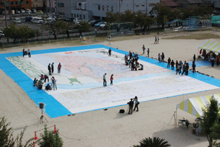市制70周年記念事業として野外揮毫大会「ひとつなぎの大揮毫」が八幡小学校グラウンドで行なわれました。様々な思いの詰まった言葉が紙いっぱいに埋め尽くされ、巨大なモザイクアートが完成しました。