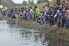 当日600人ほどの親子での参加者が集まり、春日井市八田川沿いの「ふれあい緑道」の堤防や河川敷の草刈り、ゴミ拾いを行いました。清掃後はきれいになった川で、放流した鱒を釣り、釣った魚を塩焼にしていただきました。参加者達からは「通学路で通る川がきれいになって、身近に感じた。これからは川の事をもっと大切にしたい。」など、環境と共に生きる大切さを実感したコメントをいただきました。